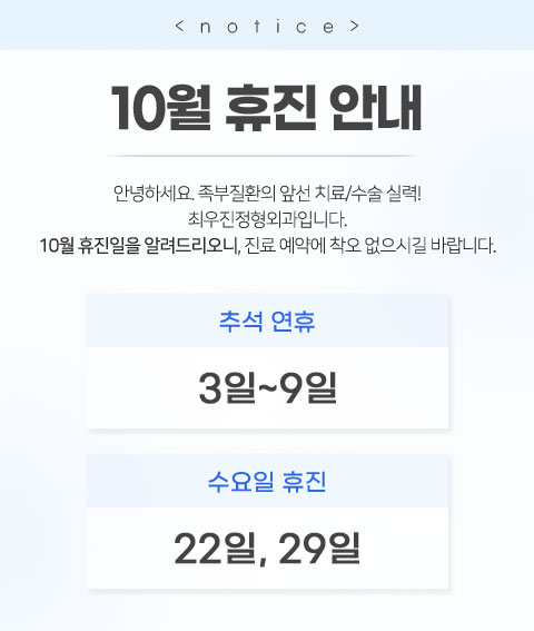 안녕하세요. 발/발목 질환 치료 및 수술에 새지평을 열어가는 최우진정형외과입니다.